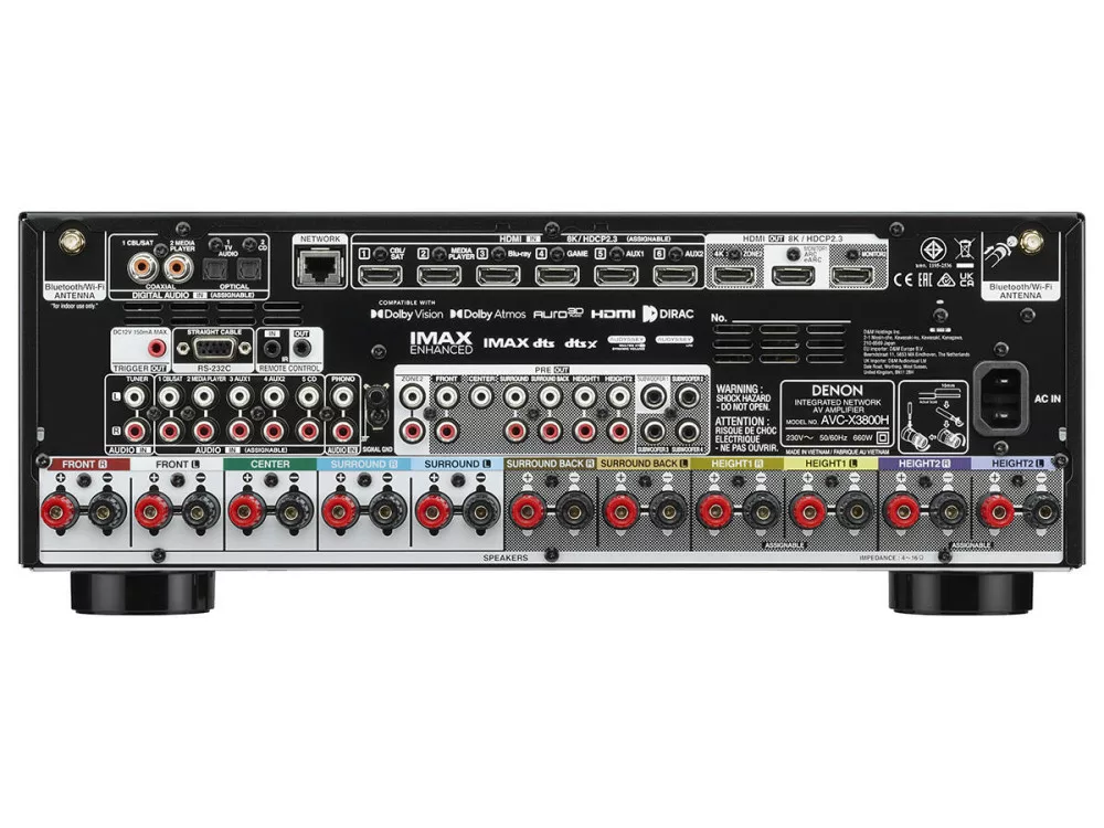A Denon AVC-X3800H egy 9.4 csatornás házimozi erősítő, amely csatornánként akár 180 W teljesítményt biztosít, és támogatja a Dolby Atmos, DTS:X, IMAX Enhanced és Auro-3D hangformátumokat. A készülék 8K Ultra HD felbontást kínál, és kompatibilis a HDR10+, Dolby Vision, HLG és Dynamic HDR technológiákkal is. A HEOS® Built-in funkciónak köszönhetően vezeték nélküli zenelejátszást és több szobás audio rendszert tesz lehetővé. A HDMI 2.1 csatlakozók támogatják a legújabb játéktechnológiákat, mint a VRR, ALLM és QFT. A Denon AVC-X3800H ideális választás azok számára, akik prémium hangzást és modern funkciókat keresnek házimozi rendszerükhöz.